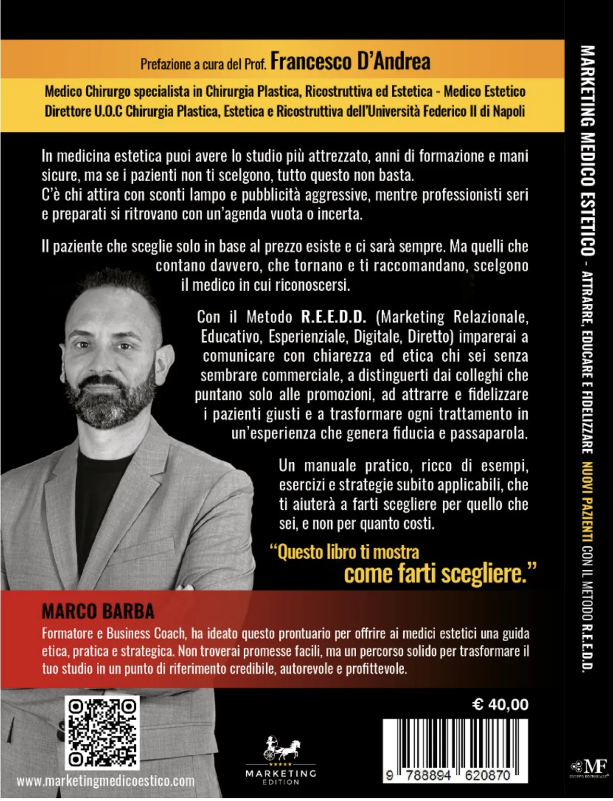 Con il libro «Marketing Medico Estetico» offre ai medici un approccio chiaro e concreto per attrarre pazienti, fidelizzarli e trasformare le loro attività in realtà stabili e profittevoli.